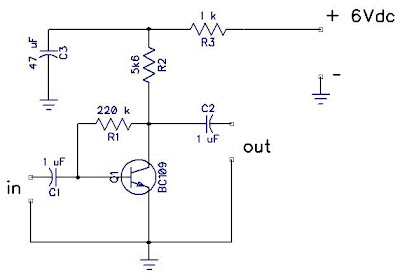 Rangkaian preamp mic 1 transistor ini cukup bagus dipakai untuk mic dinamic maupun mic kondensor, untuk transistor Q1 bisa dipakai transistor jenis TUN misalnya : C829, FCS9013, BC107, BC108, C828 dan sebagainya. Untuk pemakaian dengan mic condensor maka pada input harus diberi tegangan untuk mengaktifkan mic condensor sedangkan untuk mic dynamic bisa langsung dihubungkan ke input.
